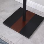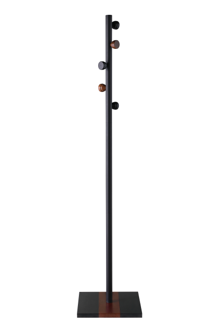 “A modern coat rack perfect for any room in your home, apartment, or office. The unique two-tone colors, black and walnut, offer a distinct modern aesthetic. This 5-hook coat tree can be conveniently placed near the entrance or door, serving as an organizer for your clothes while providing ease of access. With a sturdy solid wood base, it can hold items such as backpacks and jackets without the risk of tipping over.